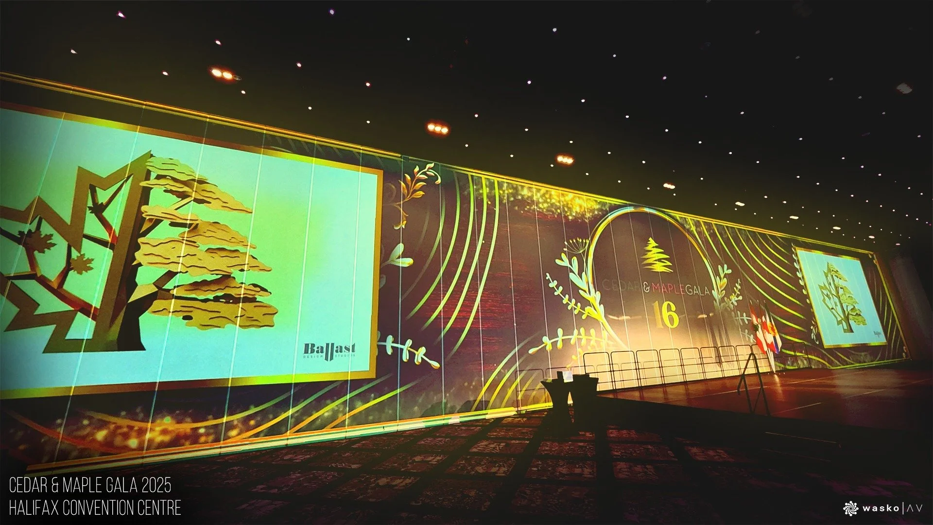 For the past several years, the Lebanese Chamber of Commerce has trusted our team to deliver an ever evolving aeshetic for their gathering of business leaders. Our designs for the Cedar & Maple Gala has incorporated projection mapping, video wall, lighting and physical sets. Our most recent iterations are a massive floor to ceiling projection surface, spanning an entire wall of the Halifax Convention Centre’s largest interior ballroom space.